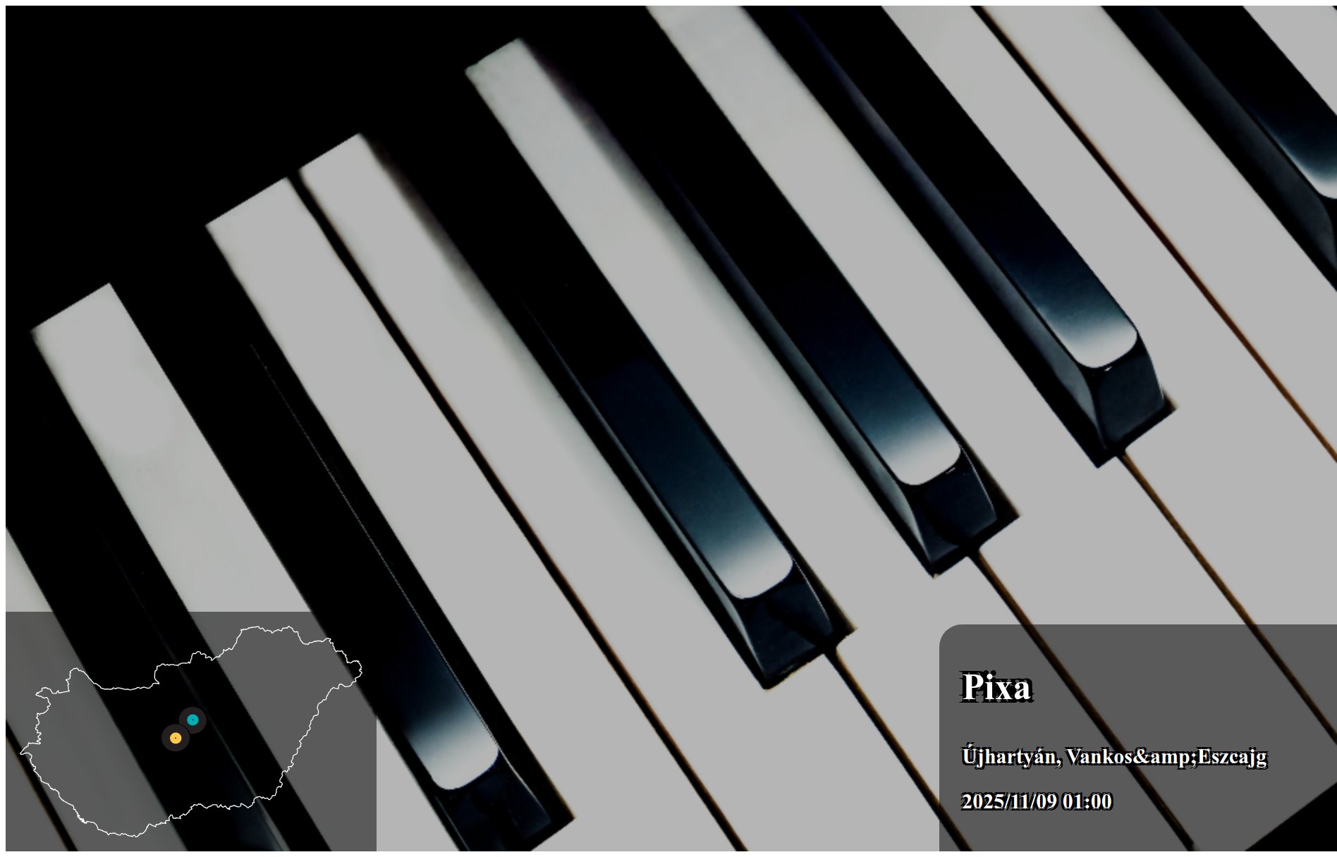 Az itt megjelenő eseményeket a produkció, vagy annak képviselője rögzítette. Az oldalon lévő információk valódiságáért a Koncertbooking.com ennek kapcsán felelősséget nem tud vállalni. Indulás előtt ellenőrizze az adott település vagy eseményhelyszín oldalán is a rendezvény paramétereit.