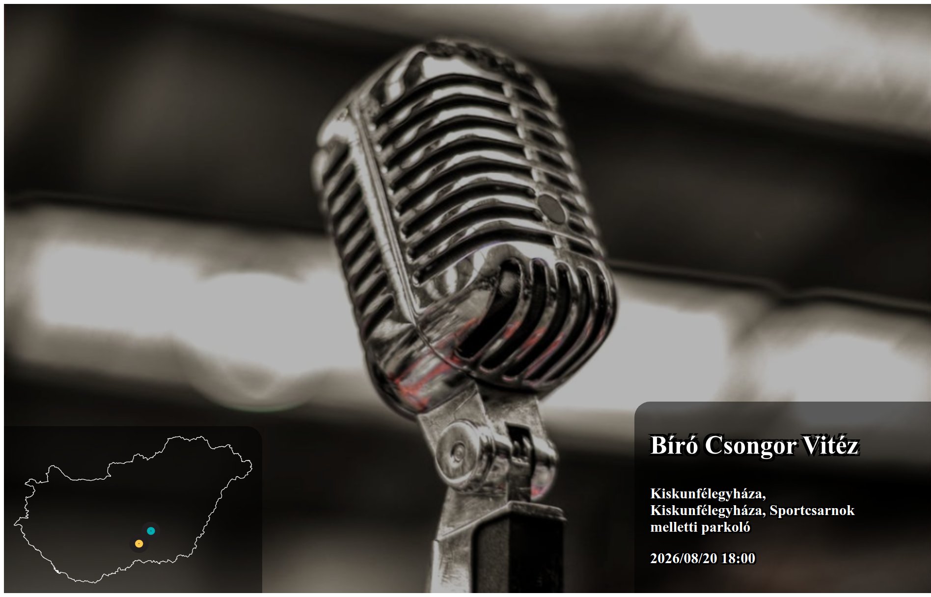 2026/05/16 17:30 kezdettel Bíró Csongor Vitéz fellépése Kiskőrös településen Kiskõrös, Petõfi Tér helyszínen kerül megrendezésre. Az esemény Nyilvános ingyenes rendezvény szabadtéren.