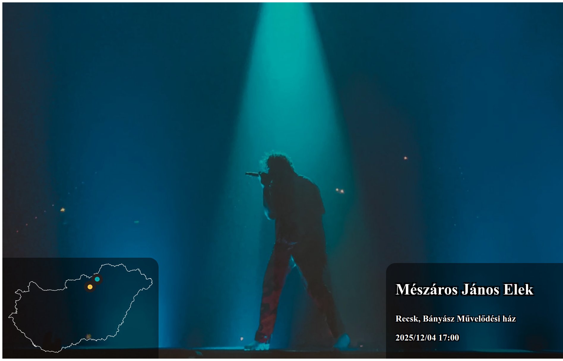 Az itt megjelenő eseményeket a produkció, vagy annak képviselője rögzítette. Az oldalon lévő információk valódiságáért a Koncertbooking.com ennek kapcsán felelősséget nem tud vállalni. Indulás előtt ellenőrizze az adott település vagy eseményhelyszín oldalán is a rendezvény paramétereit.