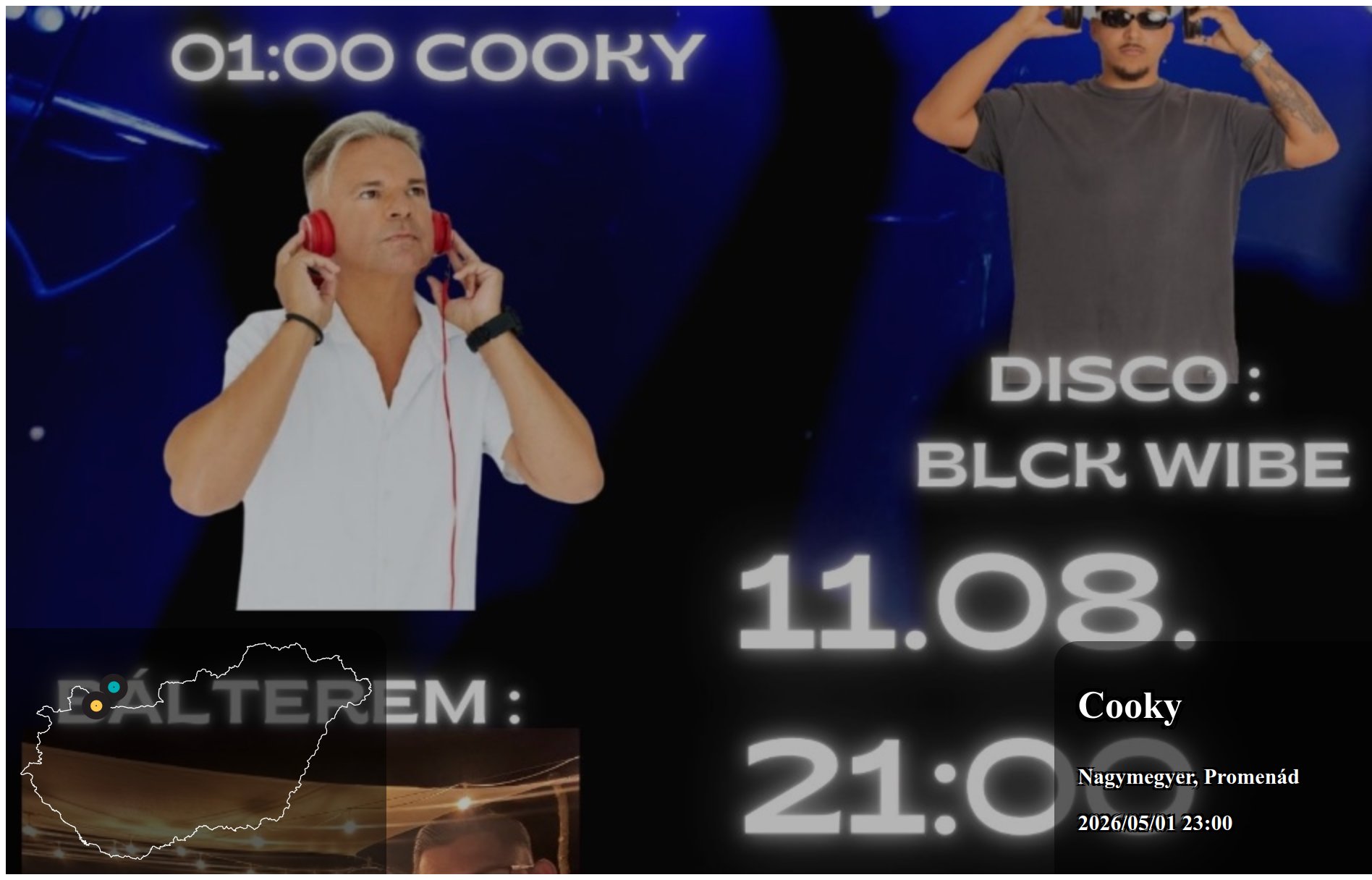 Éjfél utáni fellépések esetén a helyes keresési dátum az újonnan induló nap dátuma. Pl. Egy szombaton kezdődő klub fellépés éjfél utáni időpontja vasárnap 01:00 kor keresendő!
