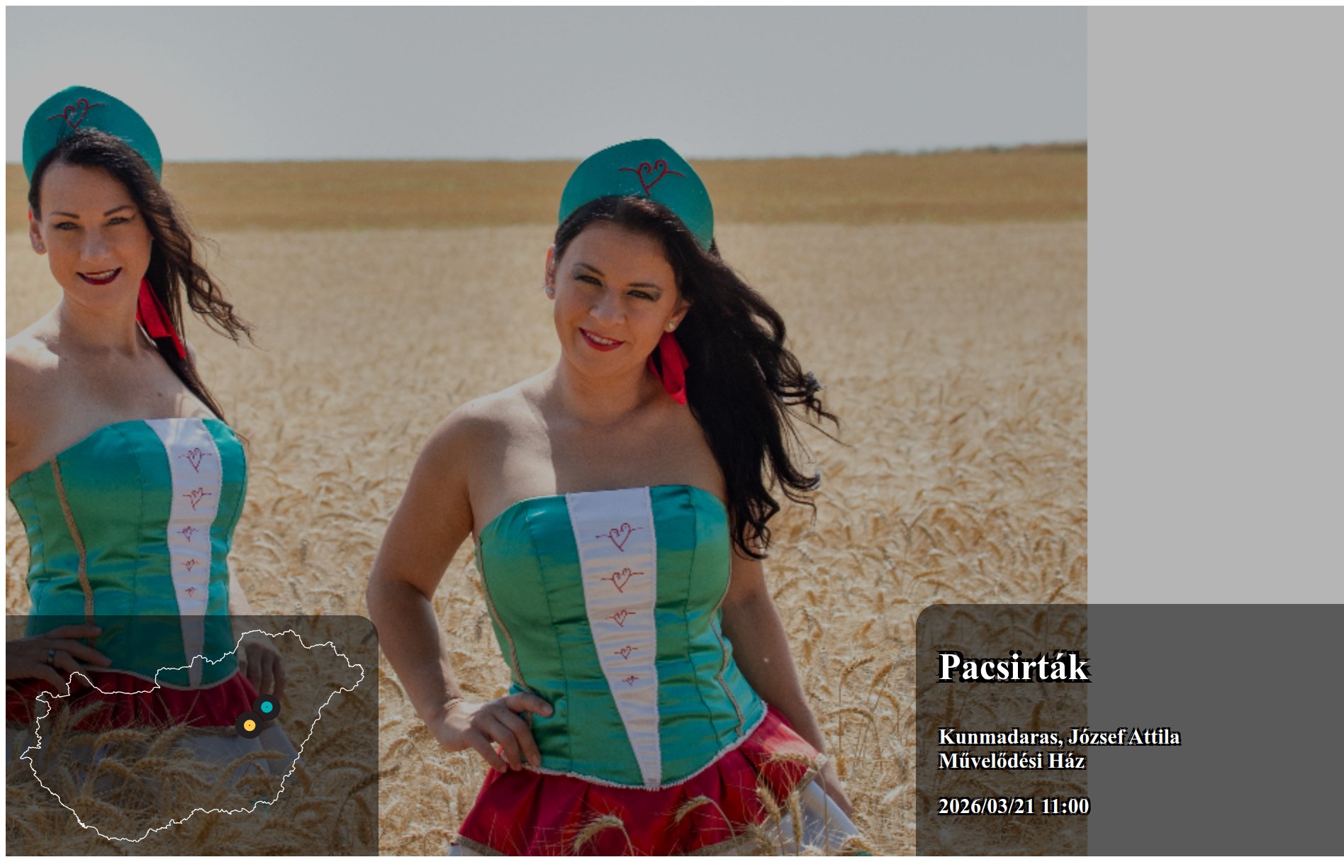 Az itt megjelenő eseményeket a produkció, vagy annak képviselője rögzítette. Az oldalon lévő információk valódiságáért a Koncertbooking.com ennek kapcsán felelősséget nem tud vállalni. Indulás előtt ellenőrizze az adott település vagy eseményhelyszín oldalán is a rendezvény paramétereit.