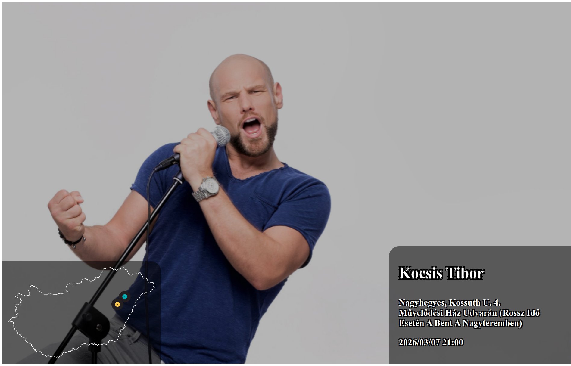 Az itt megjelenő eseményeket a produkció, vagy annak képviselője rögzítette. Az oldalon lévő információk valódiságáért a Koncertbooking.com ennek kapcsán felelősséget nem tud vállalni. Indulás előtt ellenőrizze az adott település vagy eseményhelyszín oldalán is a rendezvény paramétereit.