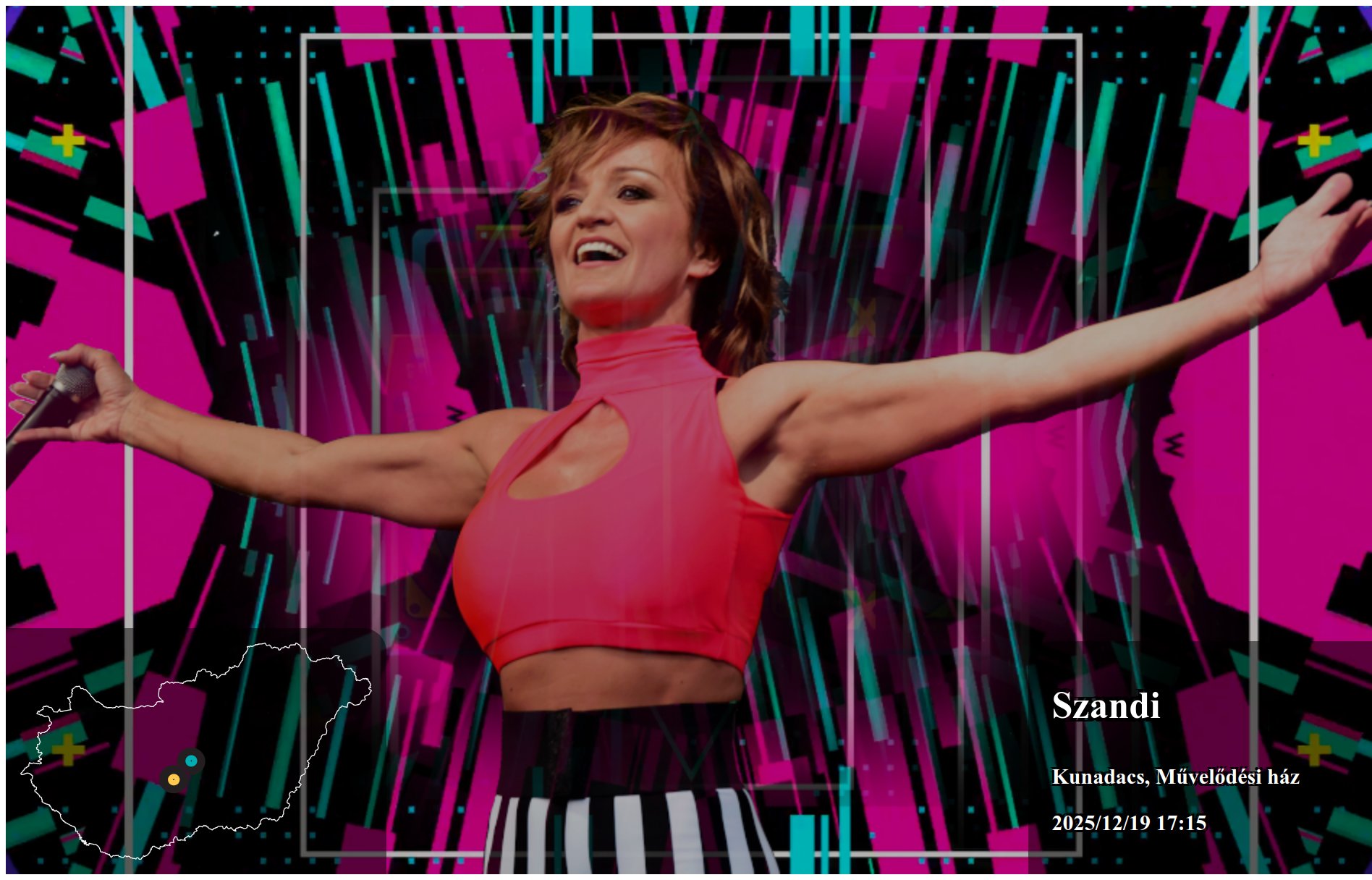 Az itt megjelenő eseményeket a produkció, vagy annak képviselője rögzítette. Az oldalon lévő információk valódiságáért a Koncertbooking.com ennek kapcsán felelősséget nem tud vállalni. Indulás előtt ellenőrizze az adott település vagy eseményhelyszín oldalán is a rendezvény paramétereit.