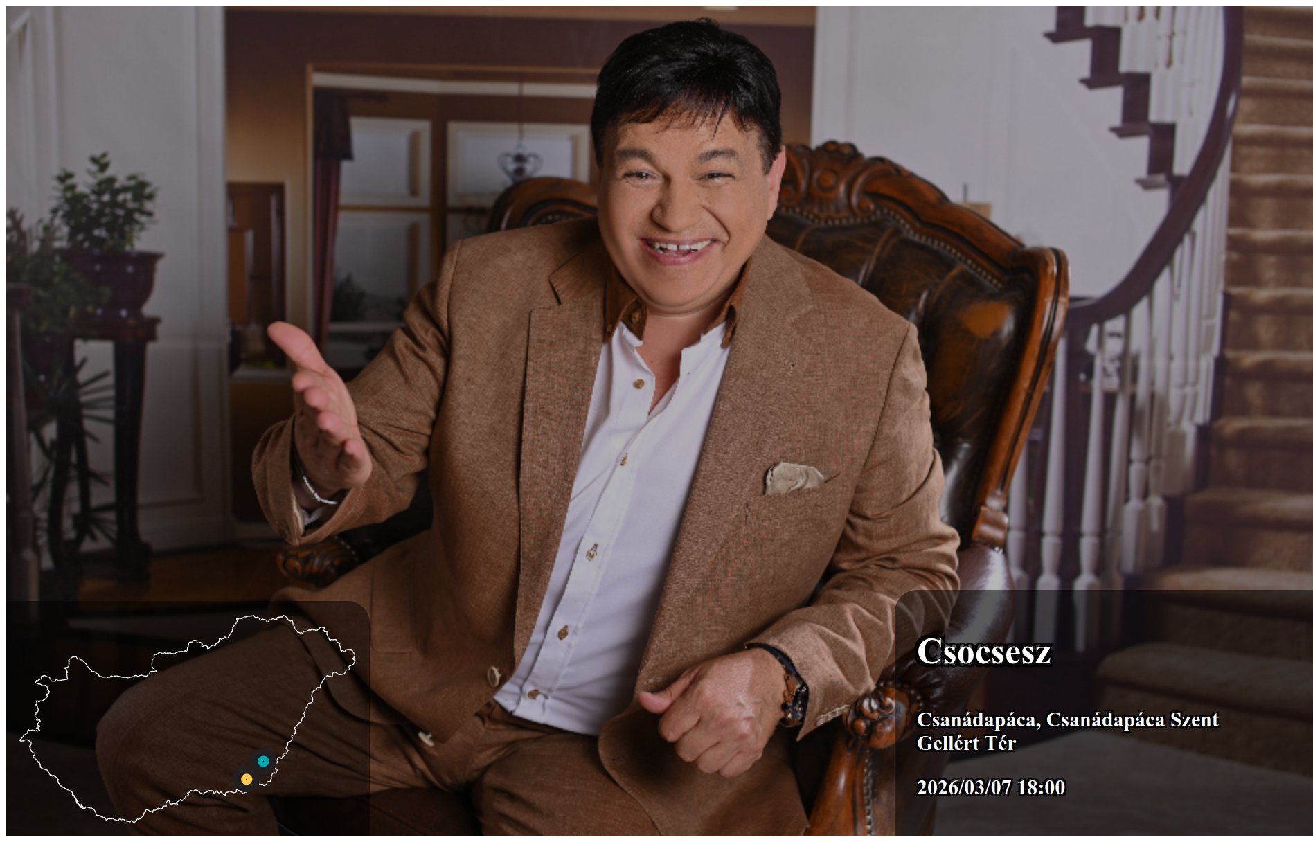 Az itt megjelenő eseményeket a produkció, vagy annak képviselője rögzítette. Az oldalon lévő információk valódiságáért a Koncertbooking.com ennek kapcsán felelősséget nem tud vállalni. Indulás előtt ellenőrizze az adott település vagy eseményhelyszín oldalán is a rendezvény paramétereit.
