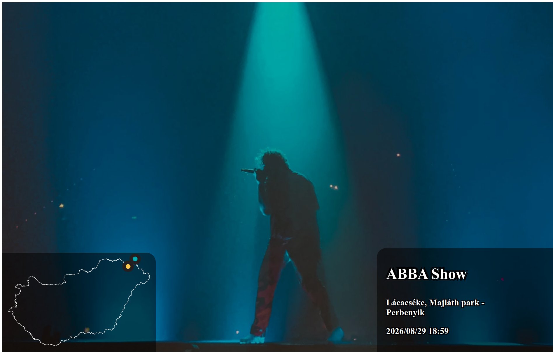 Az itt megjelenő eseményeket a produkció, vagy annak képviselője rögzítette. Az oldalon lévő információk valódiságáért a Koncertbooking.com ennek kapcsán felelősséget nem tud vállalni. Indulás előtt ellenőrizze az adott település vagy eseményhelyszín oldalán is a rendezvény paramétereit.