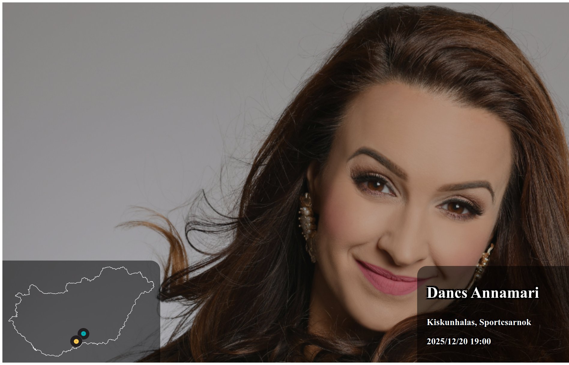Az itt megjelenő eseményeket a produkció, vagy annak képviselője rögzítette. Az oldalon lévő információk valódiságáért a Koncertbooking.com ennek kapcsán felelősséget nem tud vállalni. Indulás előtt ellenőrizze az adott település vagy eseményhelyszín oldalán is a rendezvény paramétereit.