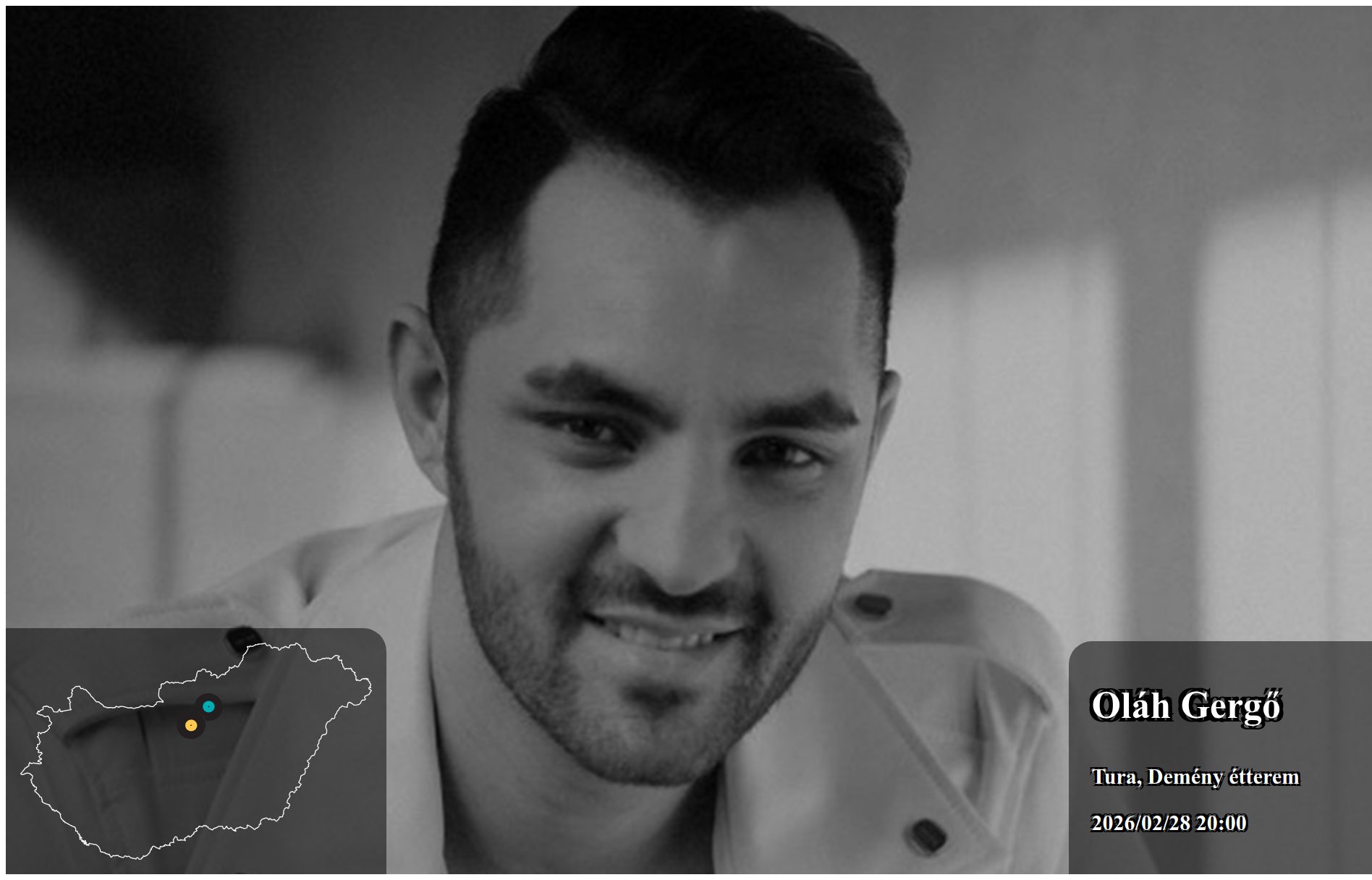 Az itt megjelenő eseményeket a produkció, vagy annak képviselője rögzítette. Az oldalon lévő információk valódiságáért a Koncertbooking.com ennek kapcsán felelősséget nem tud vállalni. Indulás előtt ellenőrizze az adott település vagy eseményhelyszín oldalán is a rendezvény paramétereit.