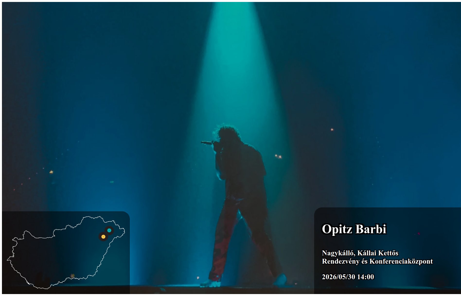Az itt megjelenő eseményeket a produkció, vagy annak képviselője rögzítette. Az oldalon lévő információk valódiságáért a Koncertbooking.com ennek kapcsán felelősséget nem tud vállalni. Indulás előtt ellenőrizze az adott település vagy eseményhelyszín oldalán is a rendezvény paramétereit.