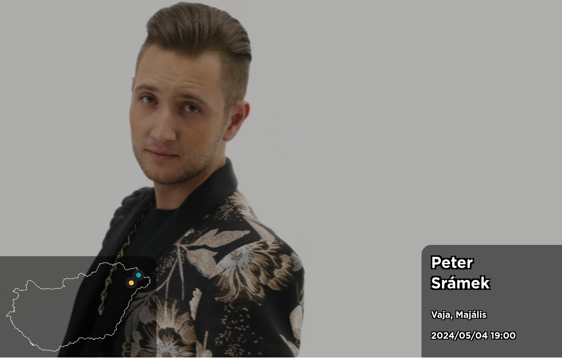 2024/05/04 19:00 kezdettel Peter Srámek fellépése Vaja településen Majális helyszínen kerül megrendezésre. Az esemény Nyilvános ingyenes rendezvény szabadtéren.
