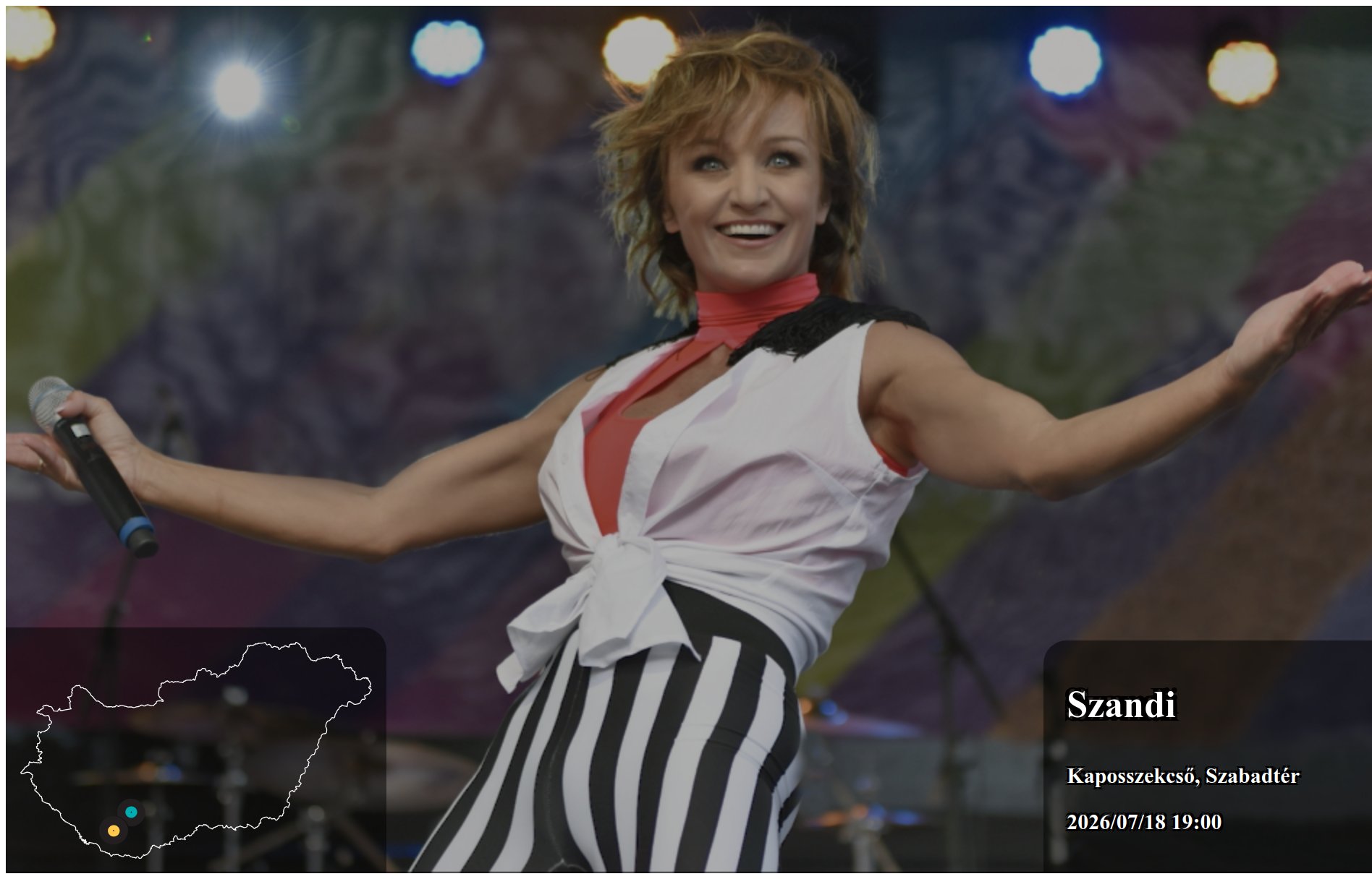 Az itt megjelenő eseményeket a produkció, vagy annak képviselője rögzítette. Az oldalon lévő információk valódiságáért a Koncertbooking.com ennek kapcsán felelősséget nem tud vállalni. Indulás előtt ellenőrizze az adott település vagy eseményhelyszín oldalán is a rendezvény paramétereit.